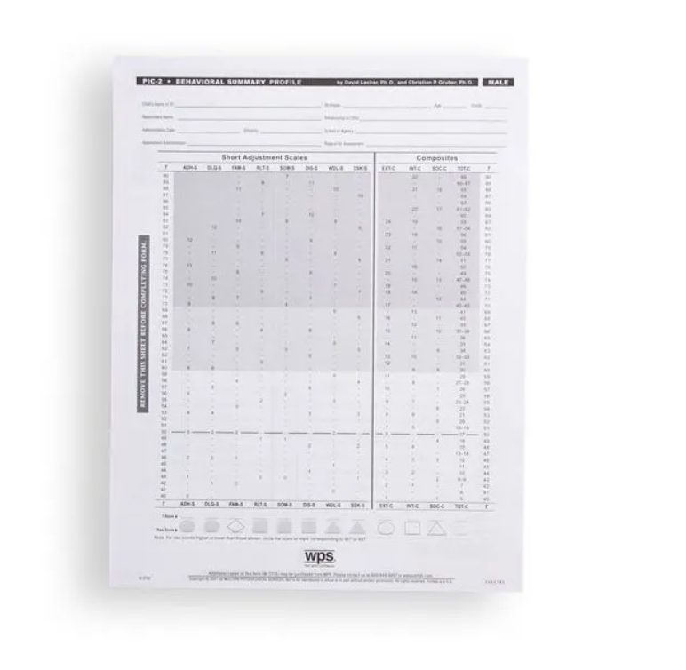 When you need a shorter administration, the PIC-2 offers a Behavioral Summary, which is comprised of the first 96 items on the test. Requiring just 15 minutes to administer, this version can be used for screening, research, or monitoring behavior change. It includes eight of the Adjustment Scales (all except Cognitive Impairment), each shortened to just 12 items. The Behavioral Summary Profile provides scores for the eight scales, plus a Total Score and three Composites: Externalization, Internalization, and Social Adjustment. Because the items on this short form are all in the present tense and all focused on conditions and behaviors that are responsive to relatively brief intervention, the Behavioral Summary is especially helpful in designing and evaluating individual treatment plans. It can be used on its own or scored as part of the full test.